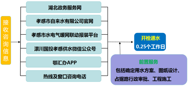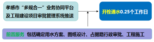 流程說(shuō)明:供水企業(yè)通過(guò)孝感市“多規(guī)合一”業(yè)務(wù)協(xié)同平臺(tái)及工程建設(shè)項(xiàng)目審批管理系統(tǒng)推送獲取項(xiàng)目建設(shè)信息后主動(dòng)對(duì)接,先行開(kāi)展確定用水方案、圖紙?jiān)O(shè)計(jì)、工程施工等服務(wù),辦理用水工程涉及的占道、掘路、占用綠地、伐移樹(shù)木等相關(guān)行政審批手續(xù),提前完成外線工程實(shí)施,為客戶提供“無(wú)感免申請(qǐng)”服務(wù)。客戶需要用水時(shí),0.25個(gè)工作日內(nèi)開(kāi)栓通水。