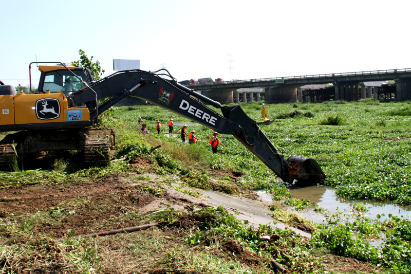 在淪河備用水源地保護區(qū),由河長辦和屬地政府組織的清剿隊已全面進場,清除作業(yè)正在緊張進行中。由于水葫蘆根系交錯,在水面上密織在一起,牽一發(fā)需動全身,常規(guī)的清除方式效率低下。為加快清除進度,清剿隊采取機械與人工共同作業(yè)、分而治之的方式,即由工作人員先駕船將成片的水葫蘆根系分割打散,切塊后推往岸邊;到近岸處再用機械反鏟上岸,堆集碾壓暴曬后,裝運到垃圾壓縮站,避免水葫蘆枯死腐敗對水源造成二次污染,確保“斬草除根”,恢復河道生態(tài)平衡。