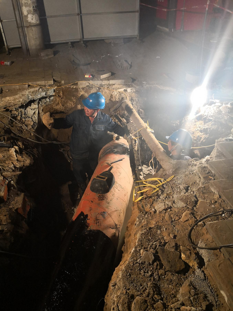 5月11日晚上10點,書院街供水管道遷移對接工程前期準備工作全部就緒。根據施工方案,書院街施工前后的閥門開始關閉,進入施工階段。23時,開始切割接通點管道并進行抽排水、拆除舊管。12日凌晨2時,進入管道安裝。6時,遷改工程的管道安裝進行砌墩,開閥門進行管道沖洗及壓力檢測。8時,管道遷改施工工作順利完成,經過十個小時的徹夜工作,累計移改DN500球墨鑄鐵管36米。由于精心組織、科學施工,整個施工過程比原計劃時間提前3個小時。
