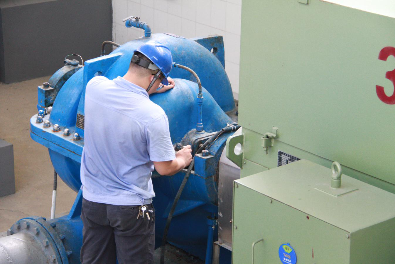 檢測結(jié)束后,維修人員又來到了送水泵房,40多度的廠區(qū)內(nèi),3個大水泵發(fā)出巨大的聲音,給原本密閉的廠房又增添了一絲燥熱。送水泵房是供水系統(tǒng)的最后一步,承擔著輸送孝感城區(qū)和周邊鄉(xiāng)鎮(zhèn)以及云夢城區(qū)和周邊鄉(xiāng)鎮(zhèn)80多萬居民生活用水的重任,水泵一旦出現(xiàn)問題,就會影響居民的正常用水。為了保證用戶的用水安全,維修人員每天都會對送水機組進行檢查和維護。通過用手摸、用眼看、用耳聽,檢查送水機組的運行狀態(tài),確定下一步的維護方案。